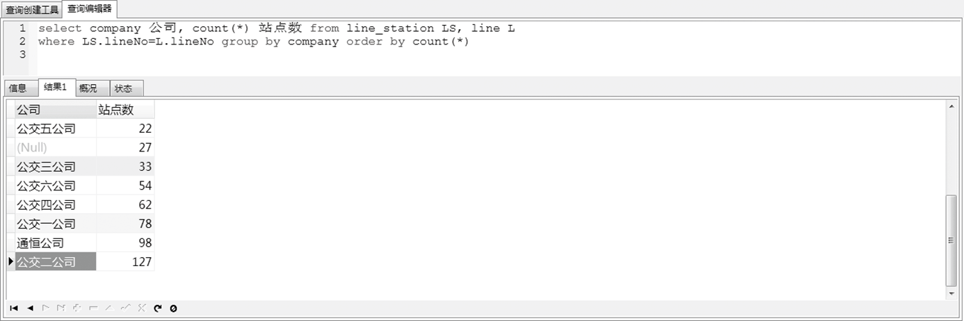 分析:解决的关键是依据公交公司分组统计该公司所有线路的站点数量,但线路车站表 line_station 中仅有线路信息即线路号 lineNo,却没有该线路所属公司信息,而线路表 line 却有公司信息即公司名 company, 并且这两张表都有线路号 lineNo。所以,可以通过连接 line_station 表和 line 表,并根据 line 表的 company 列分组统计每一家公交公司所属线路的站点总数。