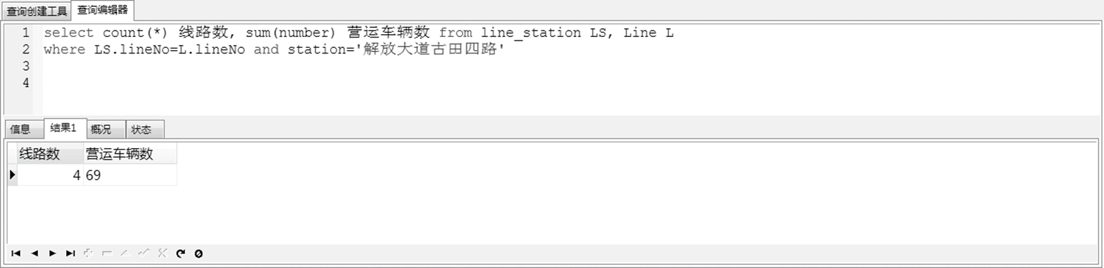 select count(*) 线路数 , sum(number) 营运车辆数 from line_station LS, Line L where LS.lineNo=L.lineNo and station=' 解放大道古田四路 '