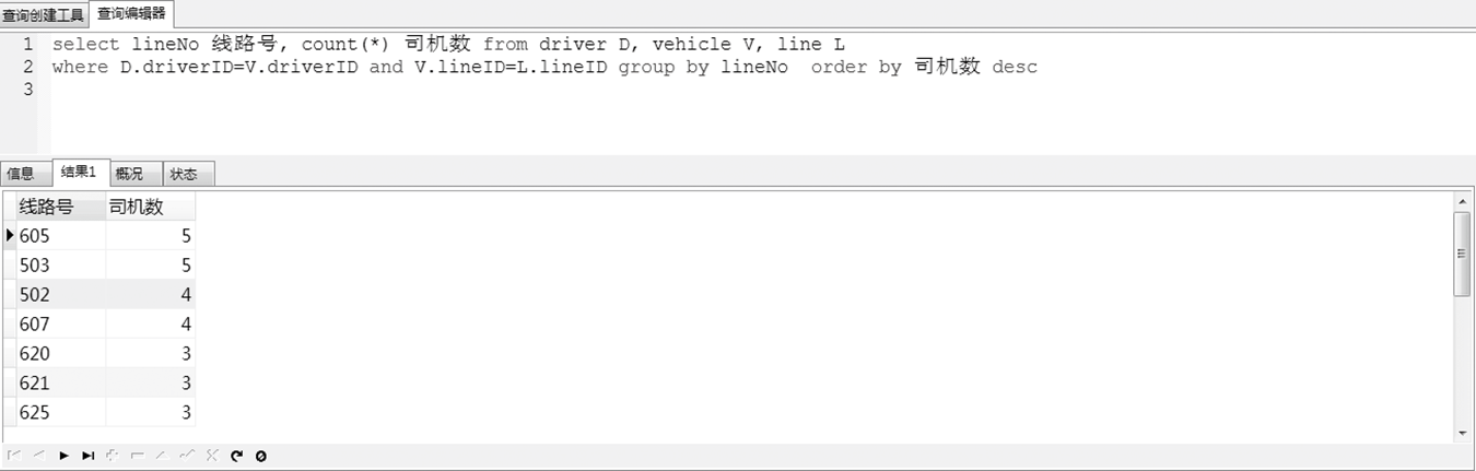 分析:司机表与车辆表有关联,车辆表又与线路表有关联,线路表有所属公司信息,所以通过连接司机表、车辆表和线路表,可以获得公交二公司所有司机的相关信息。