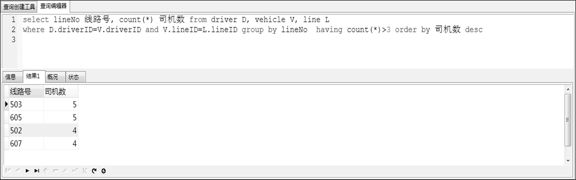 select lineNo 线路号 , count(*) 司机数 from driver D, vehicle V, line L where D.driverID=V.driverID and V.lineID=L.lineID group by lineNo having count(*)>3 order by 司机数 desc