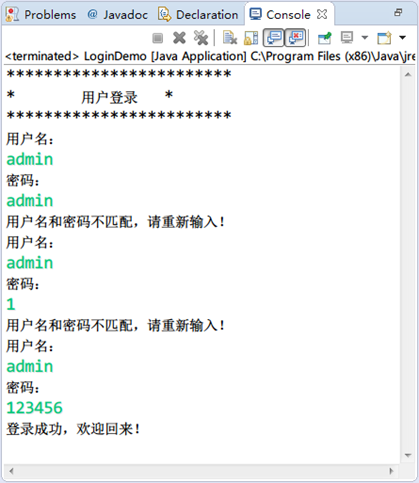 若用户名与密码输入正确,则提示“登录成功,欢迎回来!”,若用户名与密码不匹配,则提示“用户名和密码不匹配,请重新输入!”,直到输入正确的用户名和密码为止。