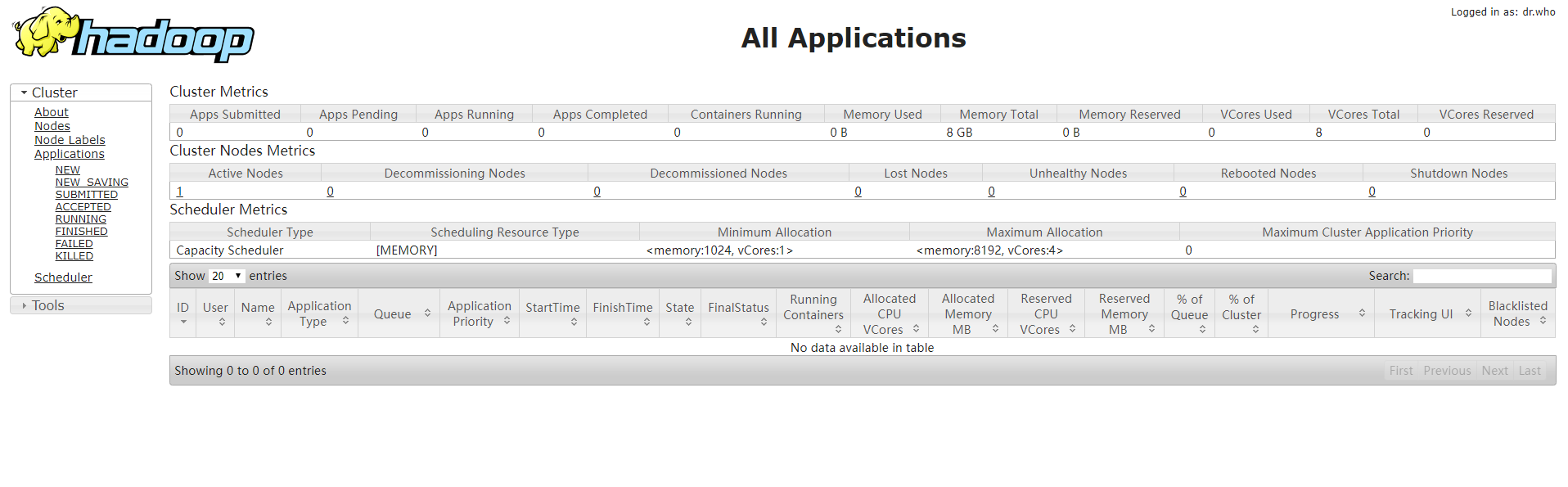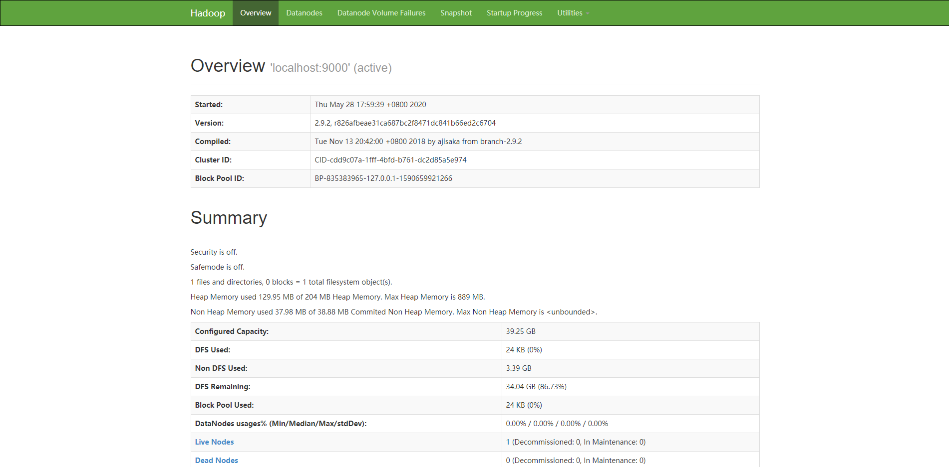 4. 打开浏览器访问http://:8088和http://:50070,显示如下界面则表示Hadoop伪分布式环境搭建完成。