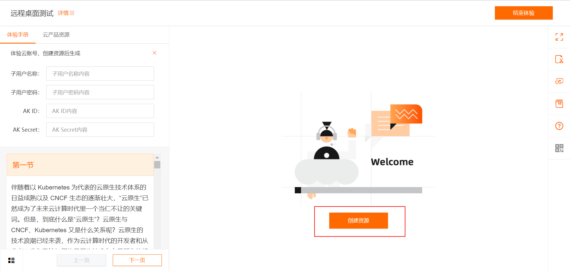 - 单击屏幕右侧 创建资源 ,免费创建当前实验所需云产品资源。