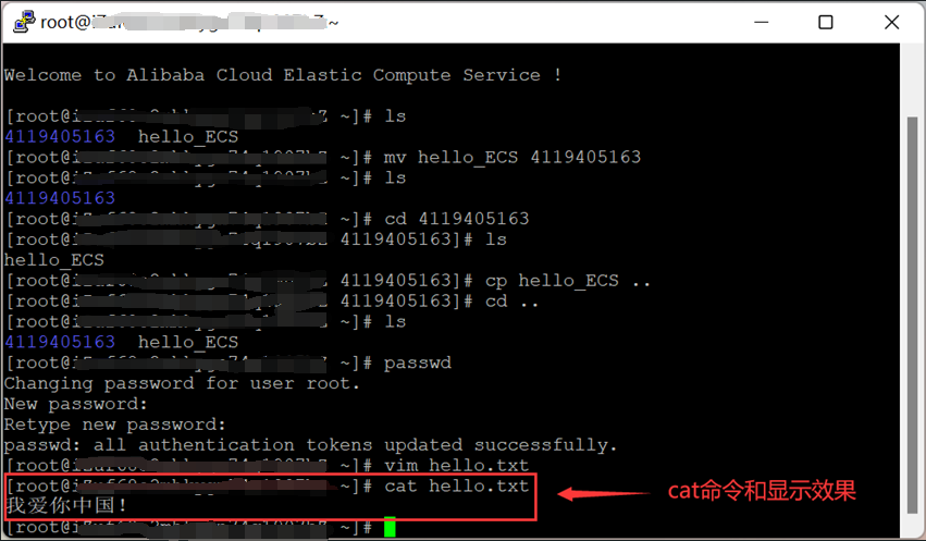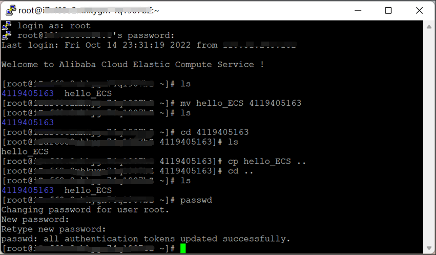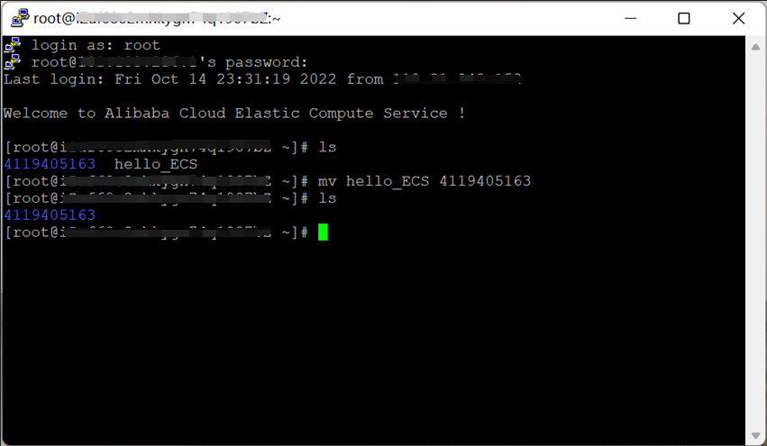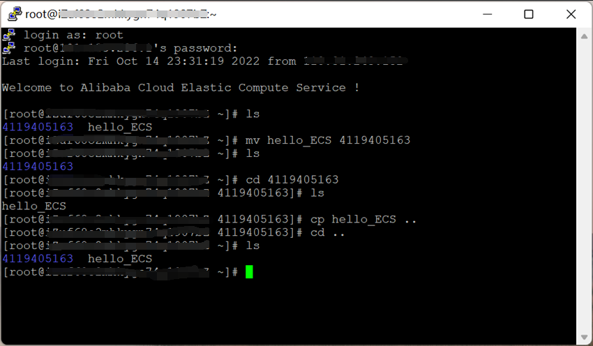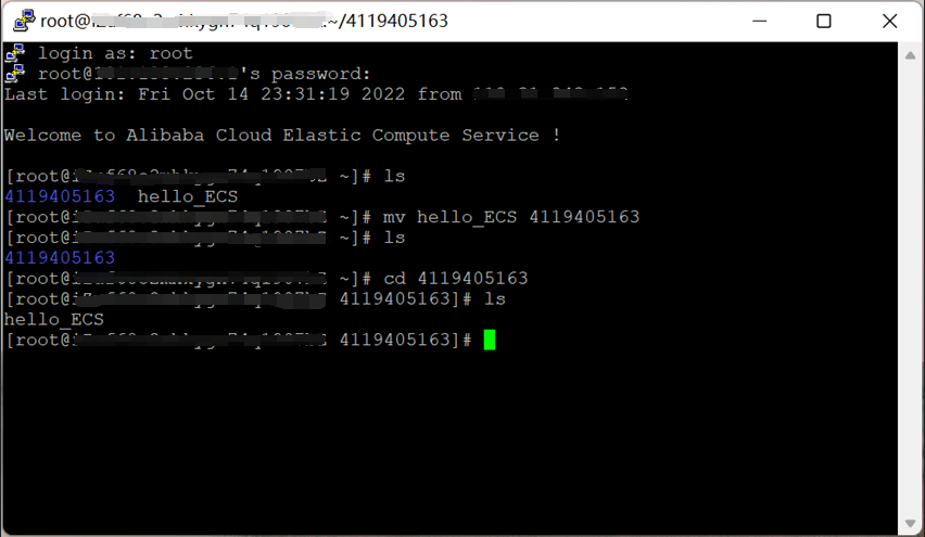 9、在putty窗口执行mv命令将当前文件夹下的hello_ECS文件移动到刚才新建的4119405163文件夹下,移动完成后再使用ls命令查看移动效果,完成后的页面如图11所示。