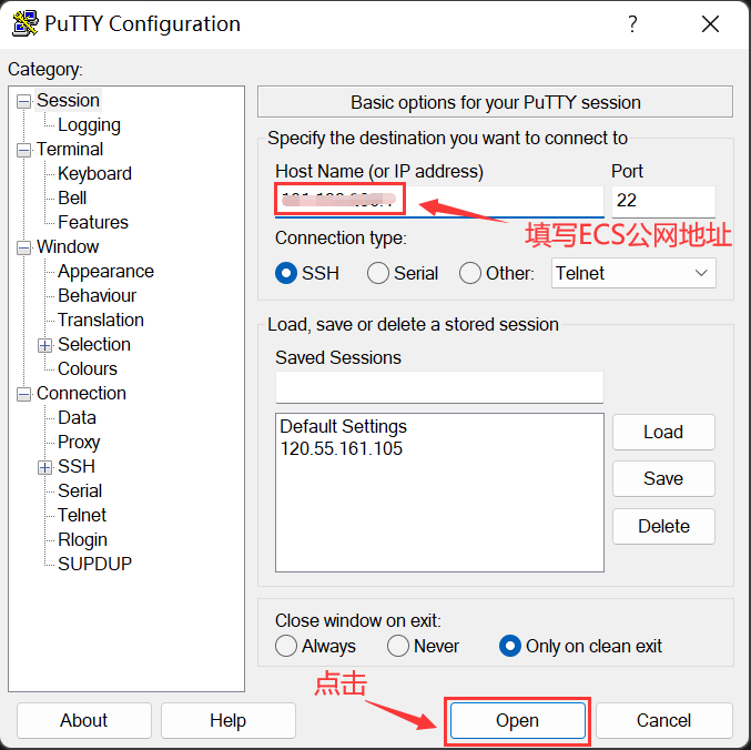6、打开下载好的putty文件,在弹出窗口的“HostName(or IP address)”输入框中输入图3中所示的“ECS公网地址:”,点击“Open”按钮,操作过程如图7所示。