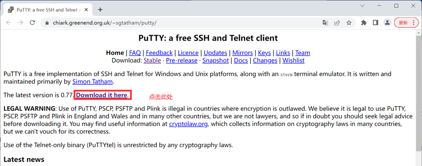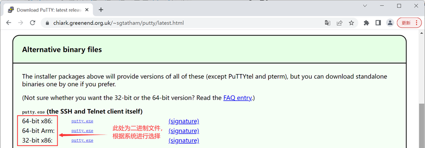 5、从putty主站点PuTTY: a free SSH and Telnet client下载putty的独立二进制可执行文件。此版本下载后无需安装,可直接打开使用,putty主站点及二进制可执行文件下载位置分别如图5和图6所示。