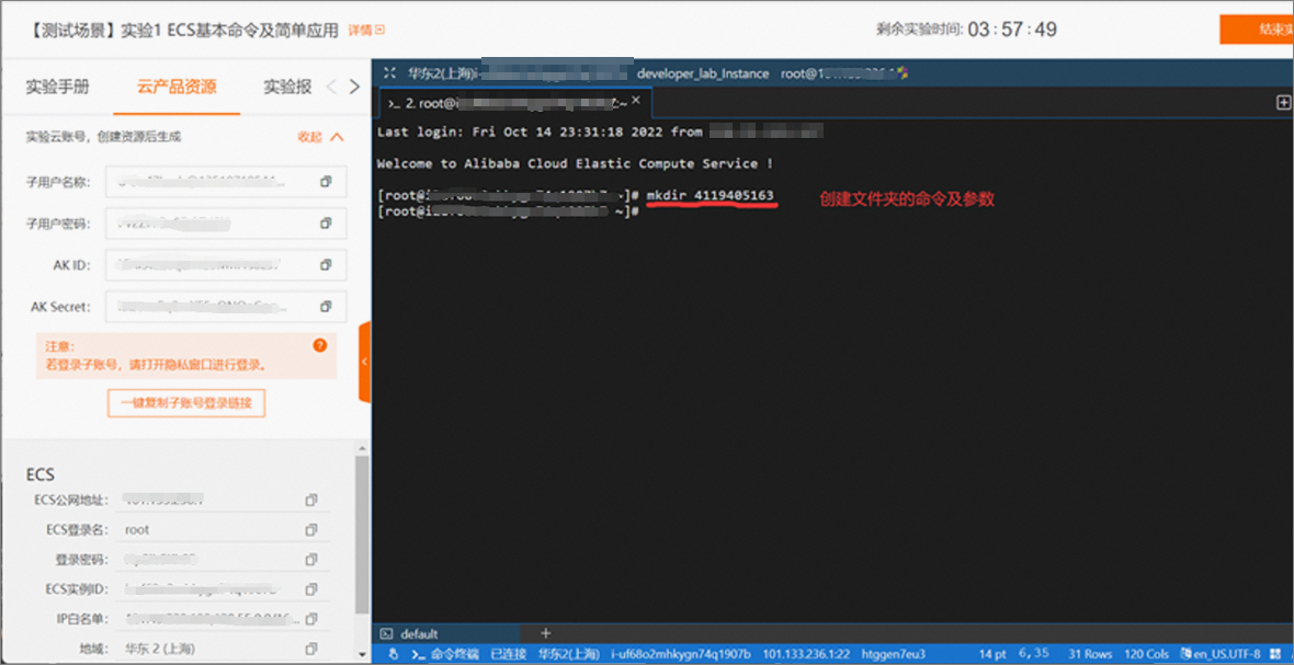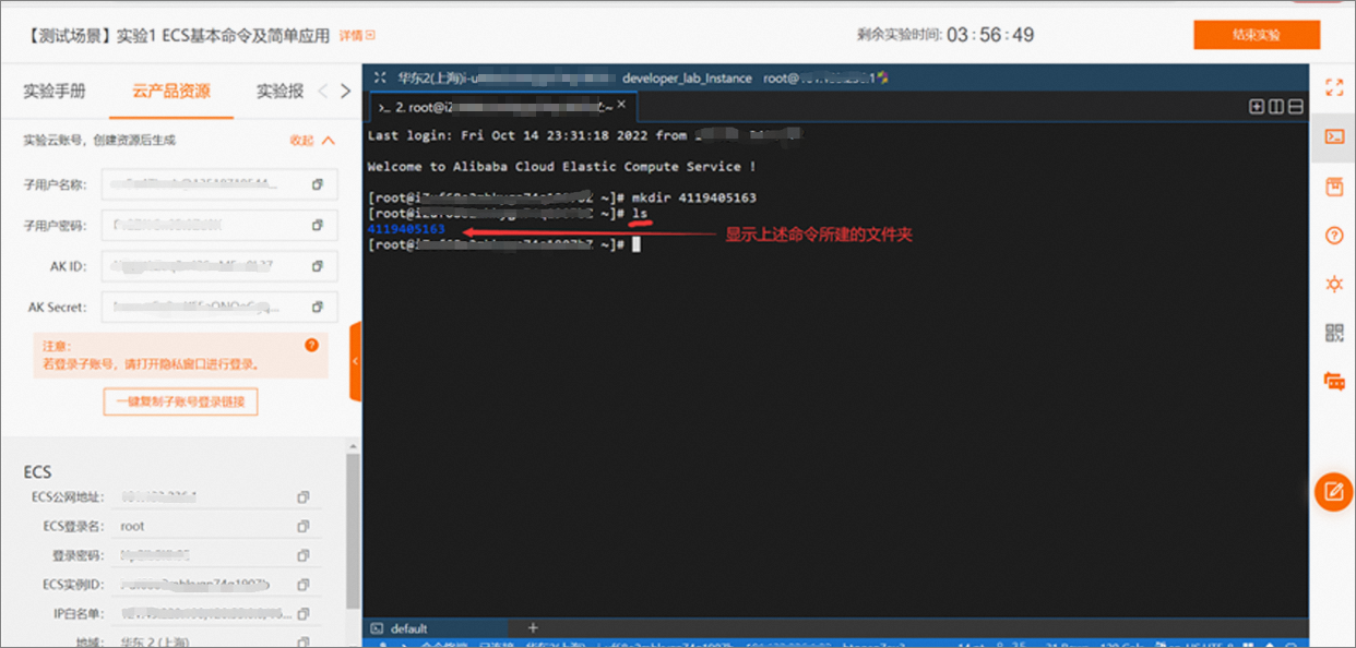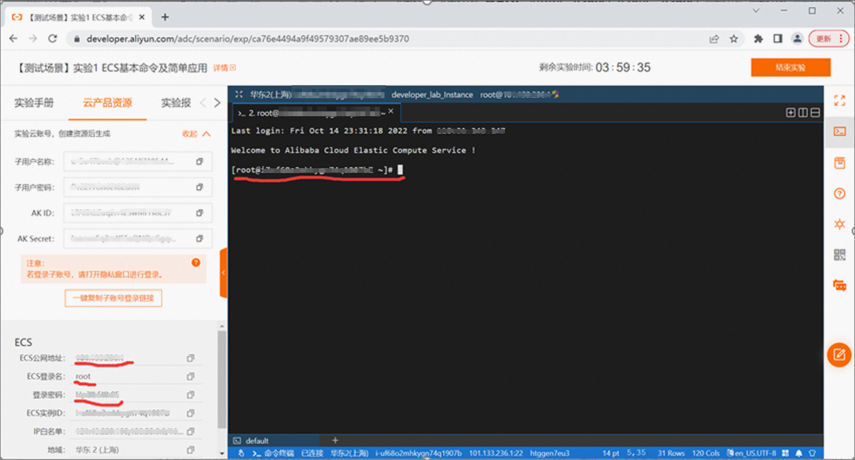 1、资源创建完成后的界面如图1所示。页面中显示了有关ECS服务器的详细信息,包括体验剩余时间、ECS服务器公网IP地址和帐户信息、用于登录管理控制台的子帐户信息,并且已经自动成功登入ECS服务器。