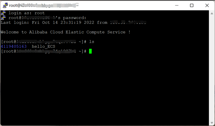 8、在putty窗口输入ls命令,会看到与图4相同的显示效果,即两种模式下操作的是同一台ECS。执行ls后的显示效果如图10所示。