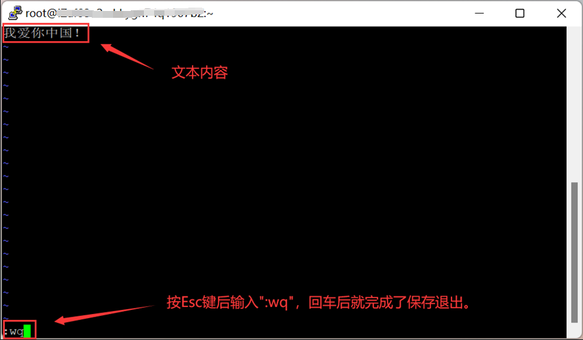 13、使用vim命令创建一个hello.txt文件,在文件中输入“我爱你中国!”,然后存盘退出。