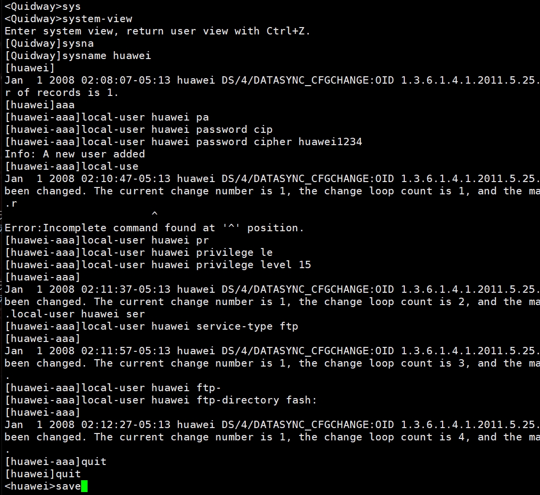 3、更改名称、进入aaa模式、打开ftp服务器ftp-server enable,设置访问用户名、密码,更改模式等保存。