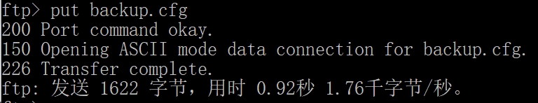 2、只是后面的get更改为put后面跟着备份的配置文件,使用dir查看是否上传成功。