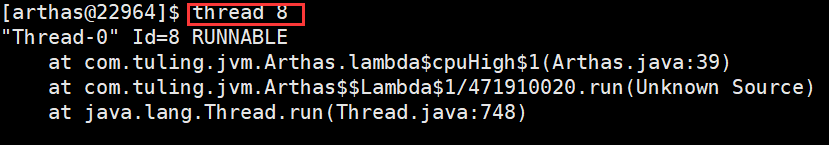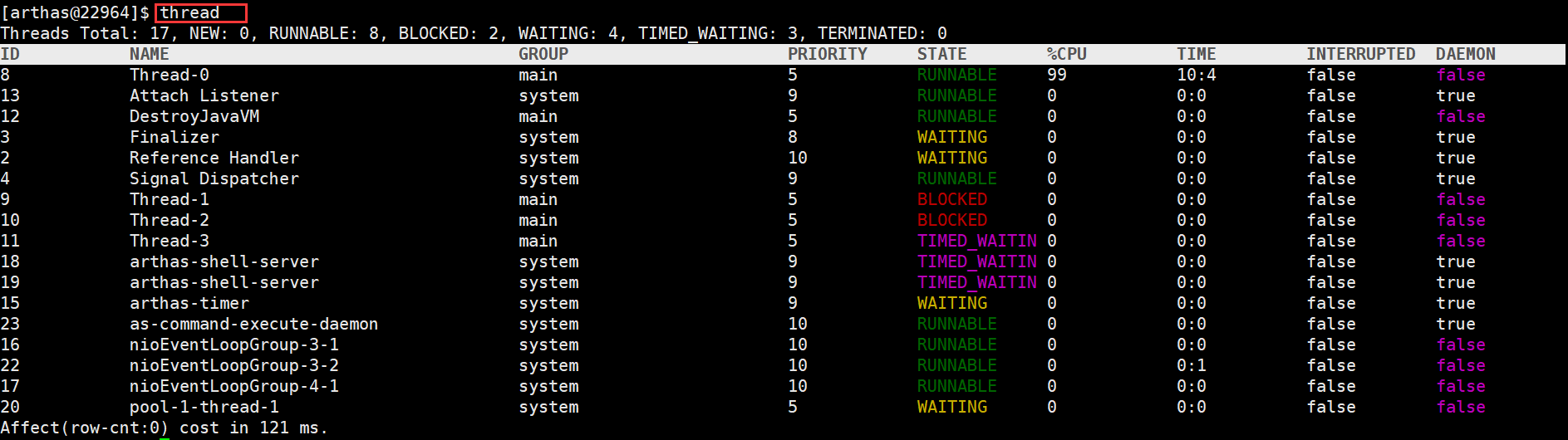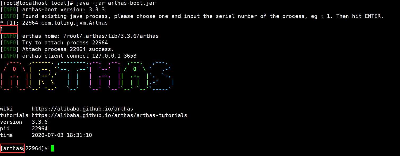 用java -jar运行即可,可以识别机器上所有Java进程(我们这里之前已经运行了一个Arthas测试程序,代码见下方)