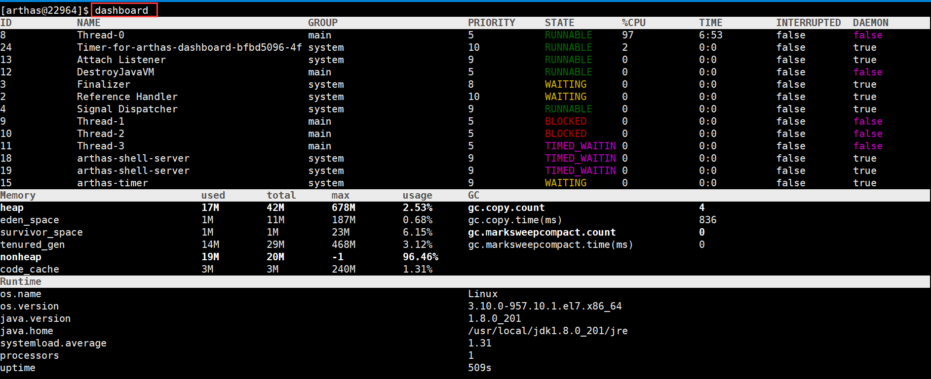 输入dashboard可以查看整个进程的运行情况,线程、内存、GC、运行环境信息: