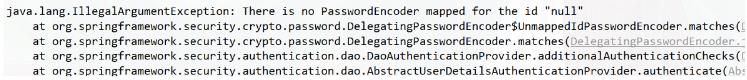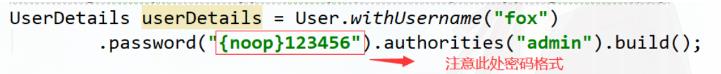 @Configuration public class WebSecurityConfig { @Bean public PasswordEncoder passwordEncoder(){ return NoOpPasswordEncoder.getInstance(); } } @Override public UserDetails loadUserByUsername(String username) throws UsernameNotFoundException { //String hashpw = BCrypt.hashpw("123456", BCrypt.gensalt()); UserDetails userDetails = User.withUsername("fox") . password("123456").authorities("admin").build(); return userDetails; }