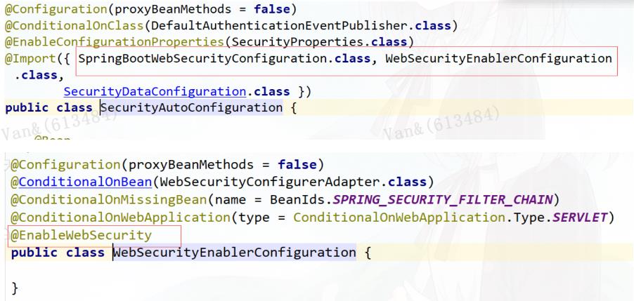 思考: 是否需要添加@EnableWebSecurity注解? springboot项目中如果引入的是spring-boot-starter-security依赖不需要添加@EnableWebSecurity,可以参考自动配置类: spring-boot-autoconfigure-2.3.5.RELEASE.jar!/META-INF/spring.factories 下SecurityAutoConfiguration