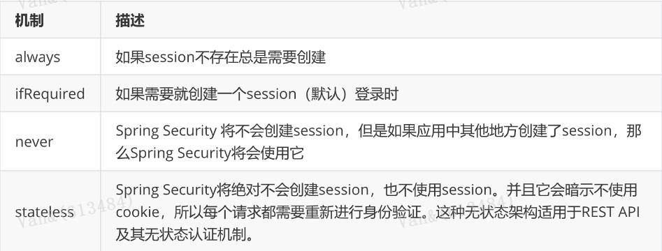 我们可以通过以下选项准确控制会话何时创建以及Spring Security如何与之交互:
