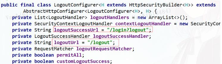 默认的退出 url 为 /logout ,退出成功后跳转到 /login?logout 。