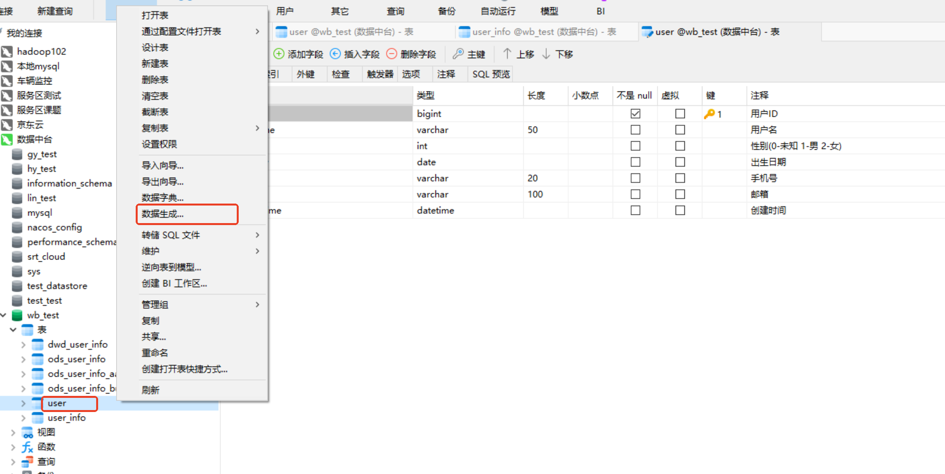 1.首先我们数据库工具依然选用最新版本的navicat17,在需要生成数据的表右键选择数据生成
