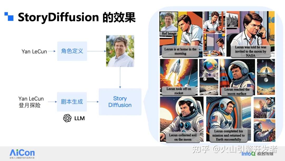 以 StoryDiffusion 的效果为例,我们可以使用角色定义模型,比如图像生成模型,输入一个角色,比如 AI 领域的著名研究科学家 Yan LeCun。我们可以得到他的形象,然后定义一个主题,比如 Yan LeCun 去月球探险。将这个主题交给大语言模型,它将生成一段剧本。这个剧本和角色形象再输入到 StoryDiffusion 中,它就能生成连续的画面,进而合成视频。在这些画面中,角色的长相保持严格一致,同时表情也很丰富,从而完整地描述了剧本和故事。