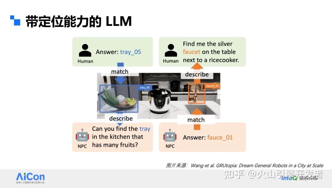 为了解决这些细节理解和幻觉问题,并进一步扩展大语言模型的能力,使其能够与物理世界进行可靠和准确的交互,我们需要让大语言模型具备一定的定位能力。这种定位能力可以是对图像上特定区域的定位,也可以是对周围 3D 环境的定位。例如,在自动驾驶或具身智能领域,我们通常将大模型视为机器人的"大脑"。在进行推理时,我们希望这个"大脑"能够参考周围实际的物理环境信息。比如,如果问它下图中水龙头或放水果的托盘在哪里,我们希望模型不仅能告诉我们具体位置,还能指导机器人去拿取或进行相应的操作。这就要求大语言模型扩展出一定的定位能力,以便更好地与物理世界互动。