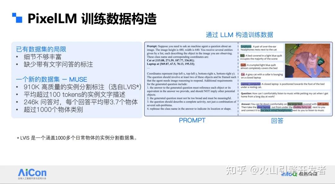 我们的具体做法是,将已有分割标注的图像输入到大语言模型中,让模型针对图像提出问题,并结合关键类别信息,如图像中包含的物体类型和场景。例如,如果图像中有一只猫、一台电脑和一张床,我们可以询问大语言模型:“这张图像里有一只猫、一台电脑和一张床,你能想到什么问题?能构造出什么样的问答?”大语言模型会根据图像中的物体信息生成问答对。