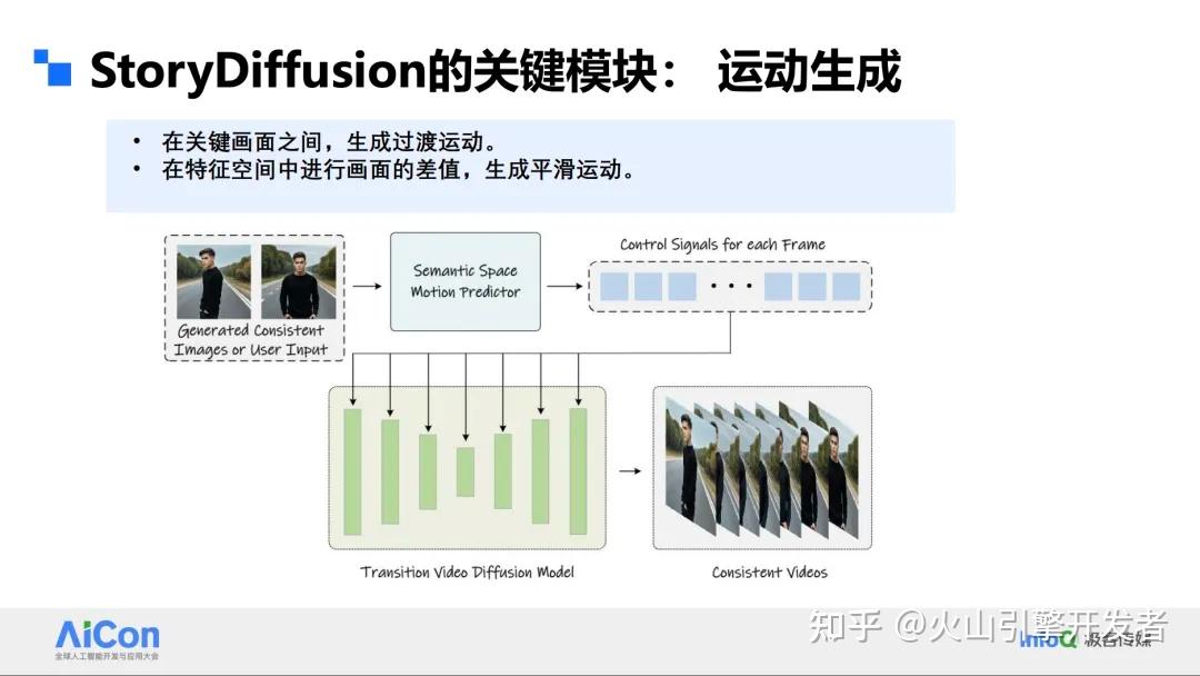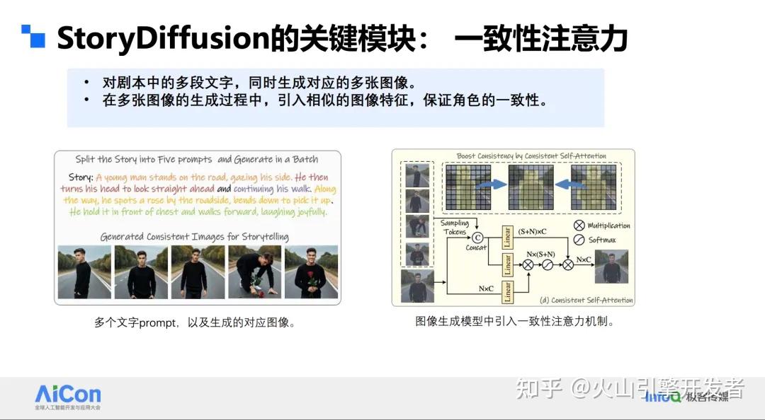 在角色定义阶段,我们可以利用大语言模型来定义角色的性格和形象,然后使用图像生成模型根据语言模型的描述来创建具体的形象。目前,AI 模型在这方面的能力是足够的。接下来是剧本和分镜的创作,大语言模型同样可以完成这项工作。这里关键在于如何生成角色一致的关键片段,并确保这些片段能够合成具有高表现力的长视频。这正是我们需要解决的重点问题。为了应对这一挑战,我们正在研究一个名为 StoryDiffusion 的模型。我们希望这个生成模型能够创作出具有表现力和吸引力的故事,而不是仅仅模拟一些刻板的模式,生成缺乏锐利度的视频。