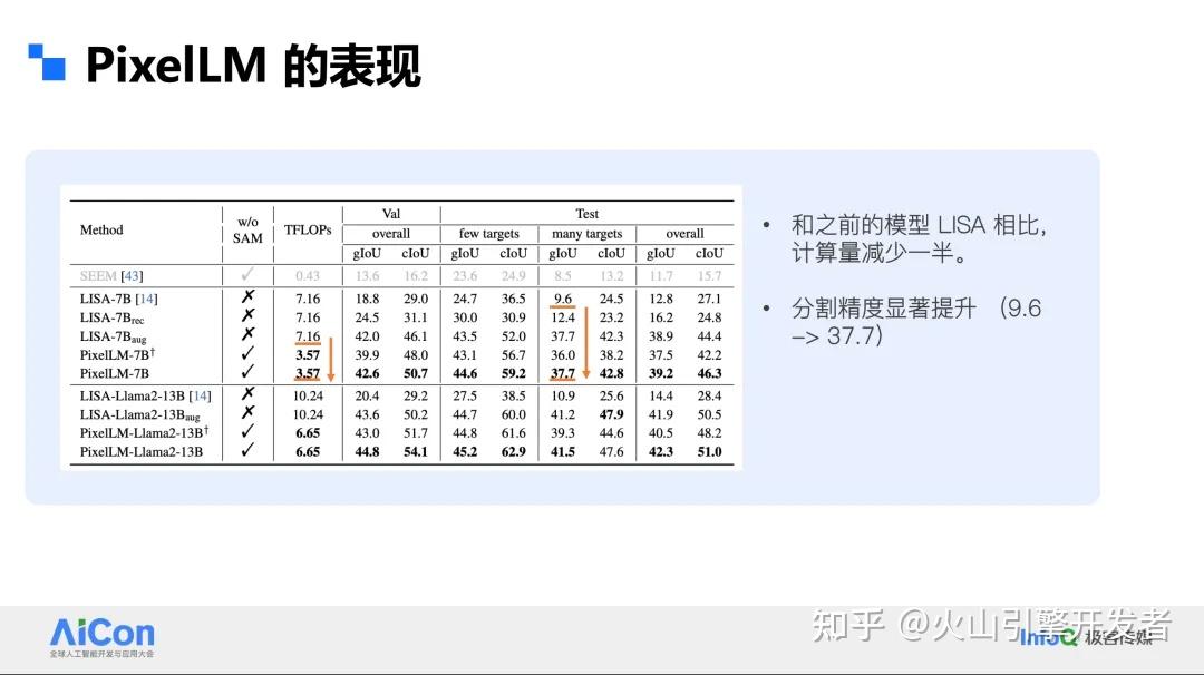 在进行模型性能评测时,尽管涉及的数字众多,但我们可以重点关注两组关键数据:TFLOPs 和分割定位的准确率。TFLOPs 是衡量模型算力的一个指标,它反映了模型的延时和效率。在我们的模型与 LISA 模型的比较中,我们模型的能力更强,但运算量却减少了一半,显示出更高的效率。此外,我们的模型在分割定位的准确率上也有显著提升,从 LISA 模型的 9.6 提升到了 37.7。我们的模型现在已经达到了一个初步可用的状态,目前团队仍在不断地迭代数据构造和模型能力,以期进一步提升模型的表现和应用范围。