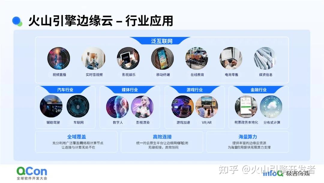 目前,火山引擎边缘云已在多个行业领域实现应用落地,包括但不限于:泛互联网领域的视频直播、实时音视频、影视娱乐、移动终端、在线教育、电商零售和媒资信息处理;汽车行业的辅助驾驶和车联网技术;媒体行业的数字人和影视渲染;游戏行业的游戏加速、AR/VR体验;以及金融行业的税票政务本地化和分布式计算等。