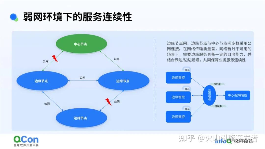 边缘节点之间、边缘节点与中心节点之间大多数采用公网连接。然而,公网链路上存在很多传输的不确定性,有可能存在传输链路抖动、机房故障、区域断网等情况,怎么在弱网环境下保证服务的连续性?依靠边缘的两个核心要点: