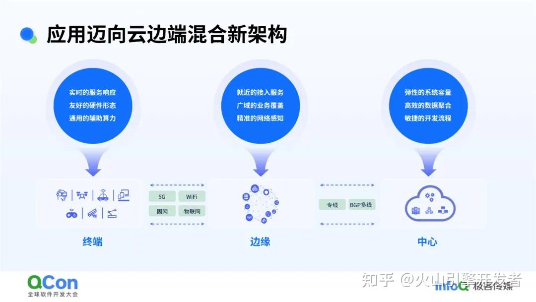 传统的中心部署架构,已经不能充分利用云、边、端这三者的资源,不能充分发挥三者的组合优势,因此我们观察到应用正在从集中部署迈向云边端混合部署的新架构。