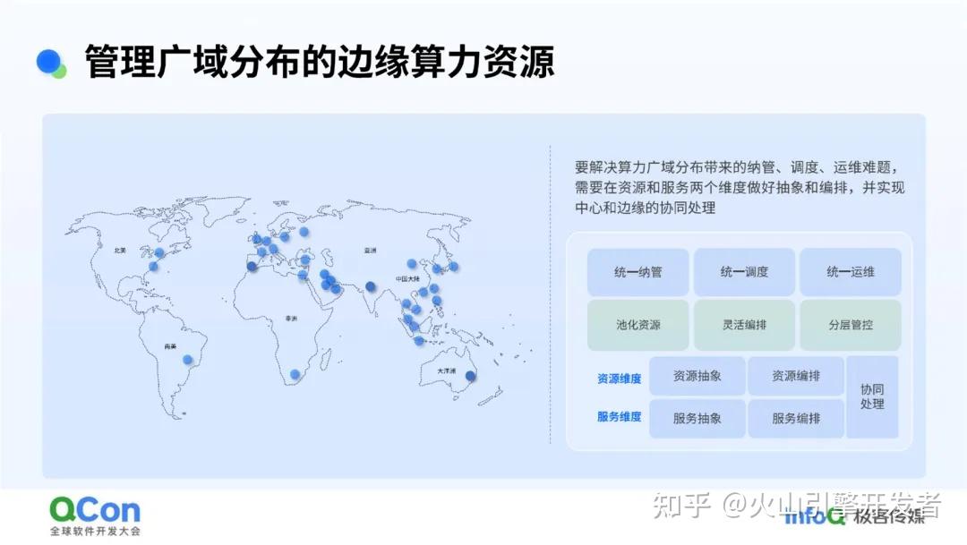 - 海量节点管控。从宏观角度来看,要提供就近的算力和网络就要从地理位置上接近客户的业务,这意味着我们面对的是广域分布的物理资源。火山引擎边缘云在全球有 2500 多个节点,如何高效管理节点、如何调度节点上的异构资源,是关键挑战之一;