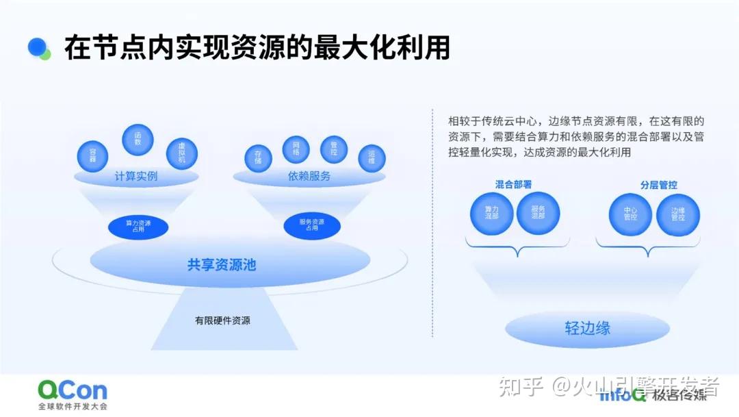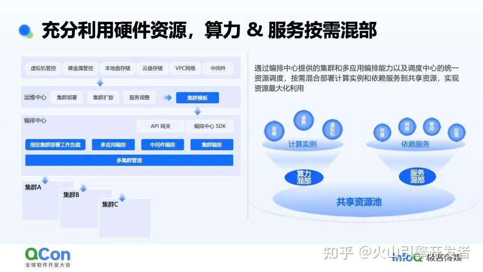 - 第一点是按需混部。每个节点可以按照业务需求发布算力和对应服务,例如不需要云盘就不用部署云盘,按需混部服务是做到小型化的路径之一。混部又包含两点,第一是算力的混部,虚拟机、容器实例、函数这些算力本身就是混部的,混合部署在同样的资源池上。其次是服务的混部,例如本地盘、云盘这类存储服务,VPC、LB 等网元服务,这些服务按照节点的需求混合部署,共享同个物理资源。算力和服务混部的底层依赖统一资源池和统一调度,也需要关联的资源隔离机制和对应系统实现。