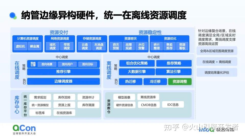 在统一资源交付背后,是在线调度和离线调度两大核心能力,在线调度负责实时为业务提供资源,离线调度负责资源运营以及为在线调度提供调度推荐。目前支持的调度域覆盖全局、区域、节点内三个维度,针对客户弹性需求,可以提供跨节点的算力资源交付。在线调度、离线调度之下是为调度提供数据支撑的库存中心系统,这里维护了线上的实时资源情况,支持对应的审计、规划和资源流转,同时为了支撑离线调度,库存中心也维护了离线计算所依赖的数据仓库,包含客户、业务画像及从实时库同步的离线信息。