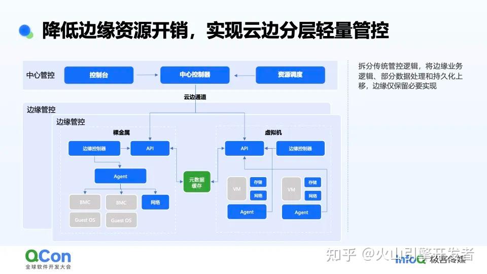 为实现轻边缘,边缘云原生操作系统在各个细分管控均引入了分层设计。通过将管控拆分为中心控制、区域、边缘管控,边缘仅保留最必要的处理逻辑,其他数据处理、持久化和业务逻辑上移至中心或区域管控,以此实现了边缘的极致轻量化。图里举了一个例子,在 IaaS 管控这一侧,拆分出中心控制器和边缘管控,裸金属的持久化数据放在中心管控维护,边缘维护的仅仅是缓存的元数据信息。
