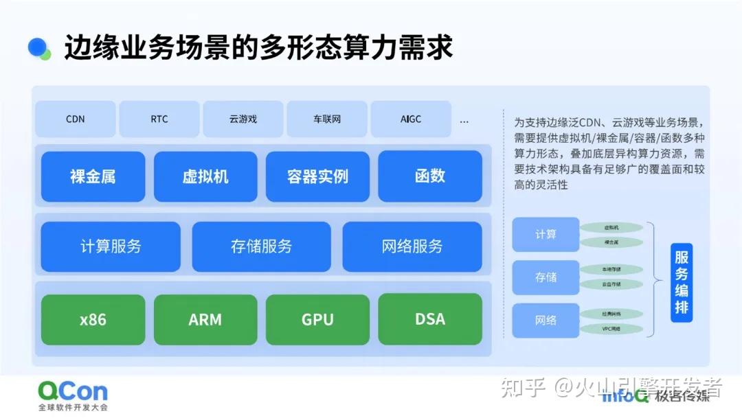 为了支持边缘泛 CDN、云游戏、车联网、AIGC 等广泛应用场景,边缘侧需要提供虚拟机/裸金属/容器/函数多种算力形态,叠加底层异构算力资源,这也要求技术架构具备足够广的覆盖面和较高的灵活性。
