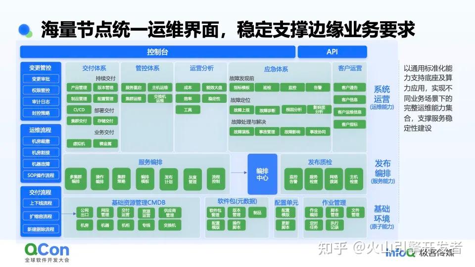 最后是支撑边缘云操作系统系统运行的关键子系统 - 运维中心,运维中心覆盖场景包括服务和资源交付、运营分析、稳定性保障等。运维能力的建设搭建在其他基础能力之上,比如基于编排中心,实现了集群编排和多集群管理。运维中心的原子能力还包括 CMDB 、软件包管理、配置单元、作业管理等,通过原子能力、服务能力打造出来的整体运维能力,支撑了边缘云操作系统和其上应用/服务的稳定运行和日常发布。