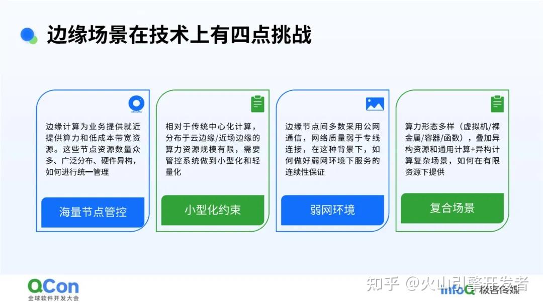 了解了整个边缘云业务状态和发展历程之后,再来聊聊发展背后对技术上的挑战。 从整体看,边缘场景有四个挑战,分别是海量节点管控、小型化约束、弱网环境、复合场景。