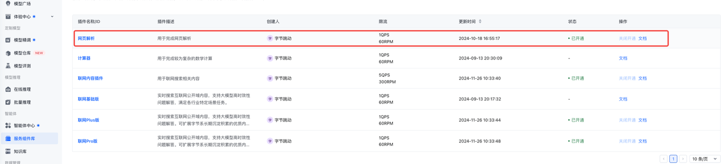 - 进入导航栏的“服务组件库”,选择网页解析插件,点击【开通】