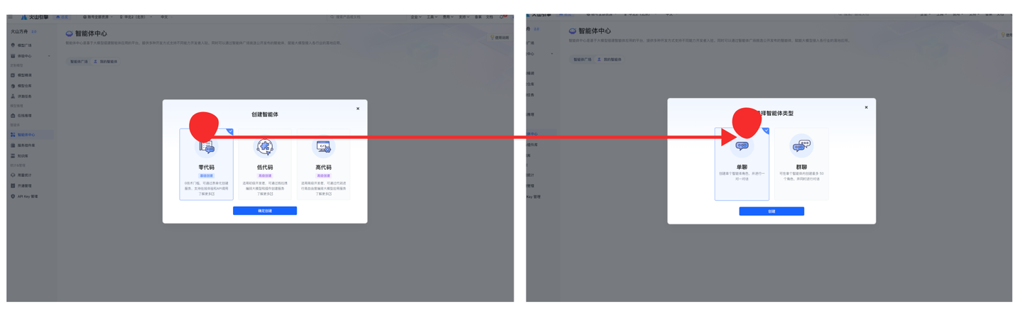 进行表单化创建之前,我们需要进入导航栏的“智能体中心”,点击【创建智能体】,并选择“零代码”,“单聊”创建方式,进入创建页面