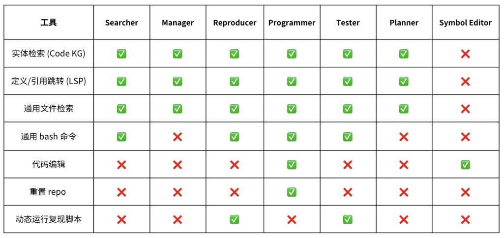 - Searcher:利用 CKG、LSP 等代码检索工具收集与当前问题相关的 repo 内代码片段;