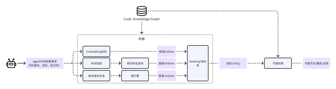 在构建完成代码知识图谱后,Agent 的代码检索请求将通过下图中的管道进行处理并实现召回。