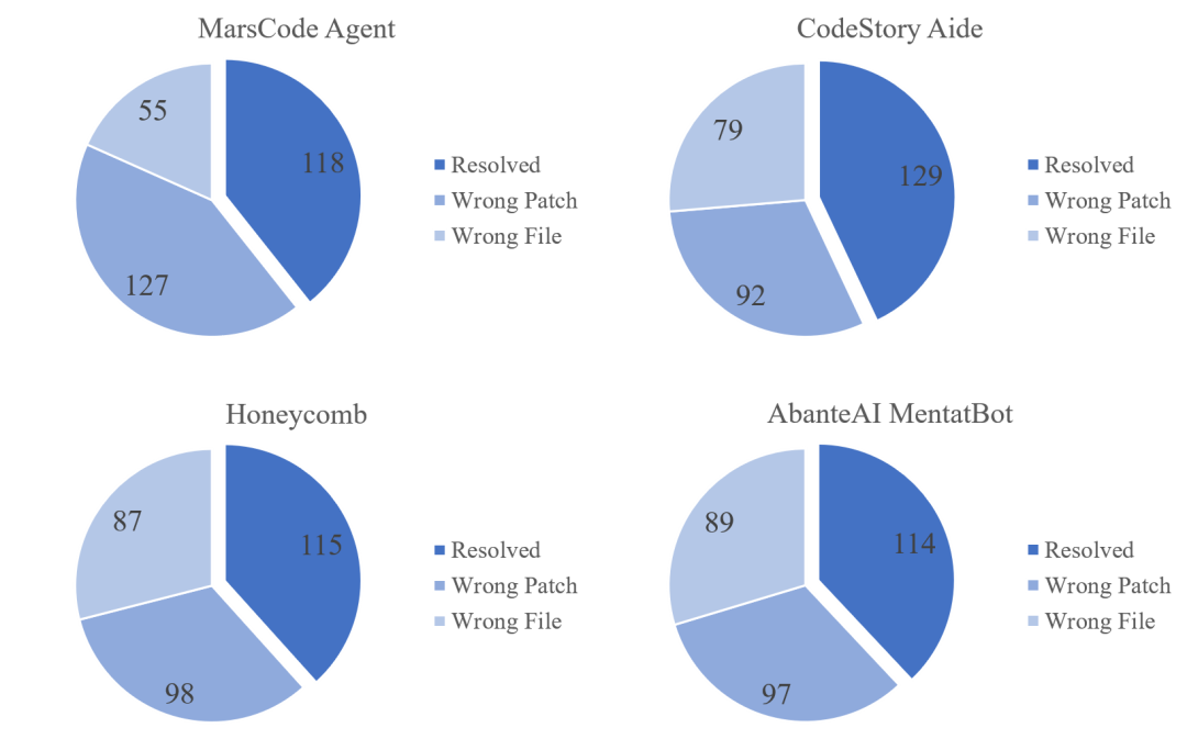 我们对目前 SWE-bench Lite 排行榜上排名前三的工具(CodeStory Aide,Honeycomb 和 AbanteAI MentaBot)进行了错误定位能力评估。对于一个 patch,如果它修改的文件和 gold patch 所修改的文件相同,则认为错误定位正确,否则错误。分析结果如图6所示: