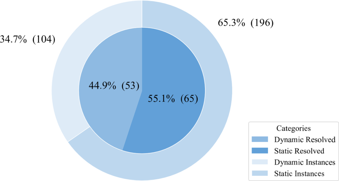我们分析了实验中静态和动态求解的实例分布,如下图所示,在所有实例中,有104 / 300 = 34.67%的实例被 Planner Agent 认为适合动态求解,196 / 300 = 65.3%的实例被认为适合进行静态求解,通过动态方式成功求解53个实例,求解率为51%,静态方式成功求解65个实例,求解率为33%。由于动态调试有缺陷复现和和验证的过程,表现在求解率上略高于静态修复。在被求解的118个实例中,有44.9%的实例是由动态方式修复,55.1%的实例由静态方式修复。