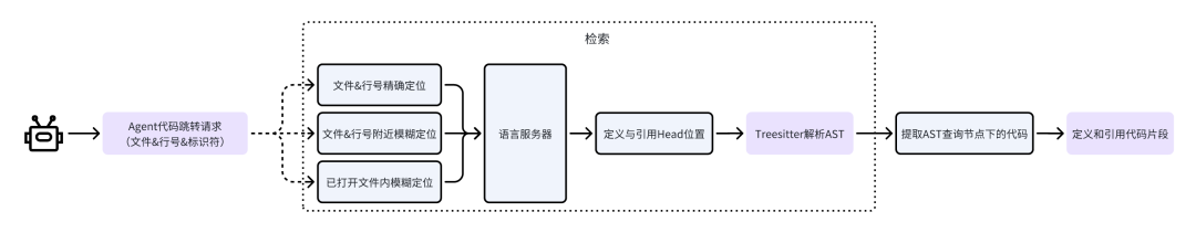 Agent 调用语言服务器进行代码召回的过程与开发者在 IDE 中使用“Ctrl+左键”点击某个标识符进行代码跳转的过程是一致的,但由于 Agent 的数字定位和计算能力较弱,我们增加了模糊定位功能以进一步强化 Agent 使用 LSP 工具的能力: