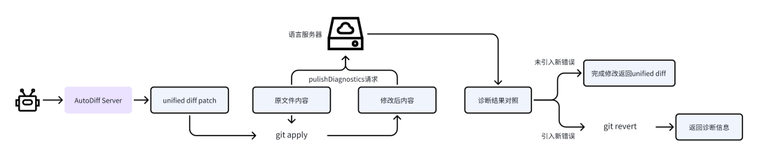 尽管 AutoDiff 能够正确完成大部分的代码编辑请求,但仍然会存在诸如类型错误、变量未定义、缩进调整错误、括号没有正确闭合等 LLM 常见的代码编辑语法问题,针对这些问题,我们使用语言服务器协议对 AutoDiff 修改前后的文件进行静态代码诊断,过程如下: