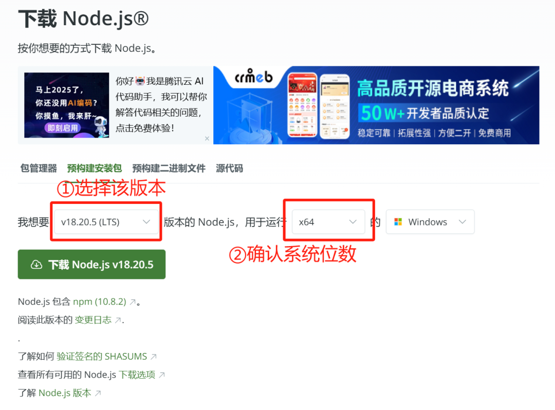 下载Node.js 和 npm<br/>1️⃣ 【下载Node.js】 下载并安装 LTS 版本 v18.20.5(长期支持版),注意选择对应自己电脑的版本。