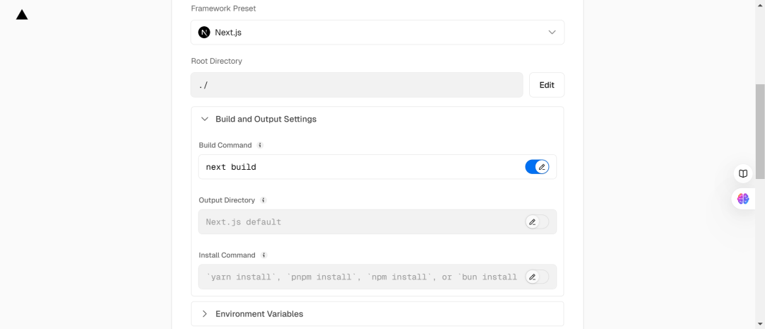 2️⃣部署目录:如果你的 Next.js 项目位于仓库的根目录,通常无需更改。如果项目在子目录中,你需要指定该子目录。