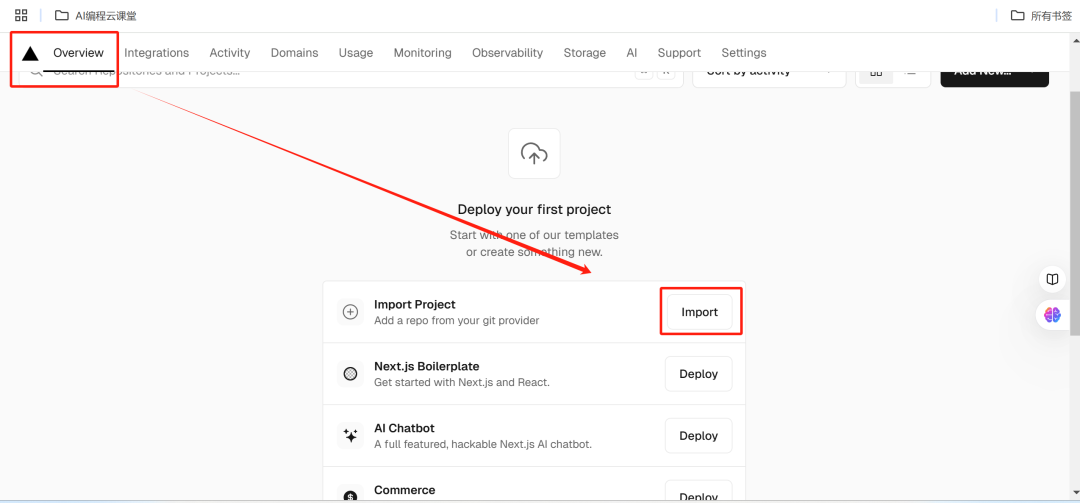 Vercel 会自动列出你在 GitHub上的所有仓库,找到并选择你刚刚推送到 GitHub的 Next.js 项目仓库,选择import