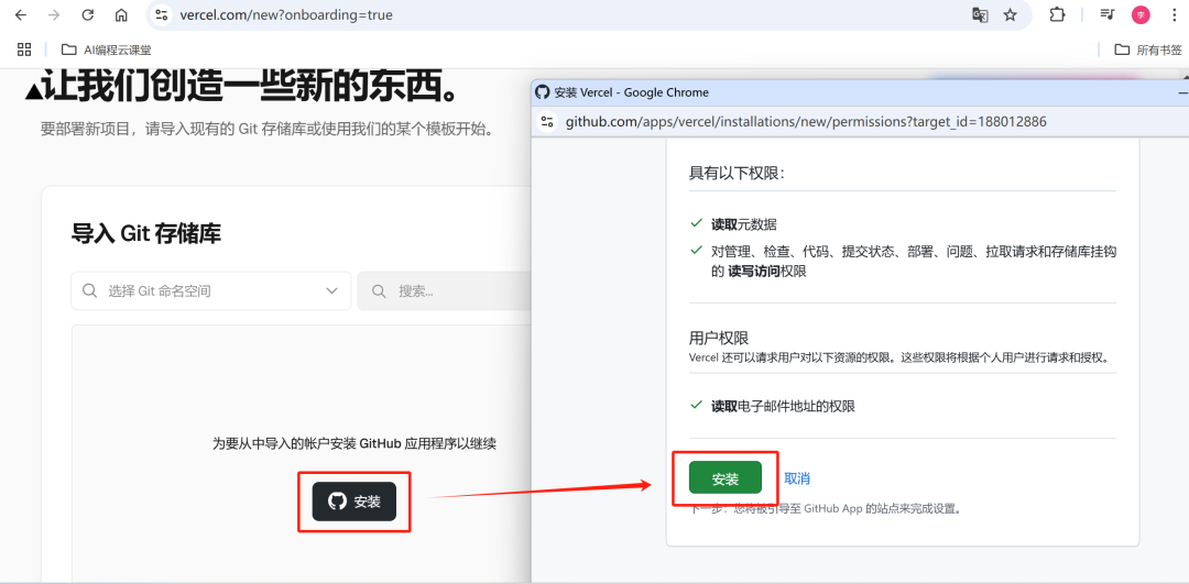 1️⃣如果你是第一次连接 GitHub,Vercel 会要求你授权它访问你的 GitHub账户。授权后,你会看到你的所有仓库列表。