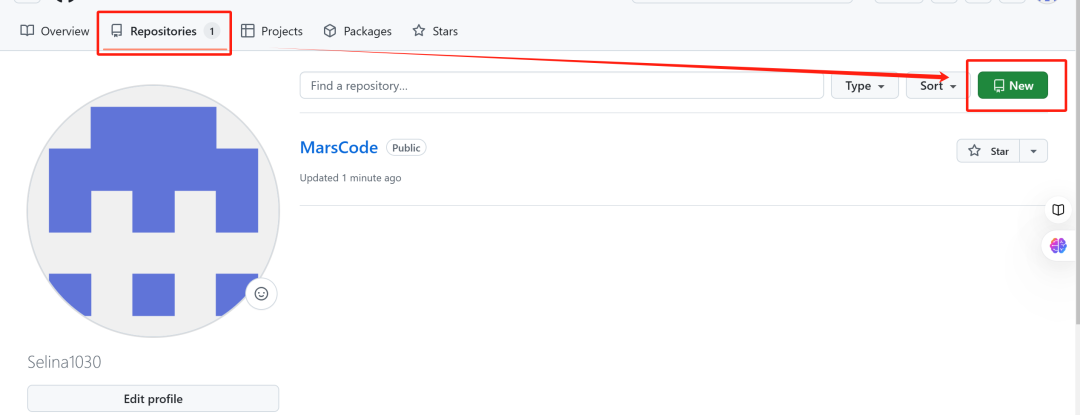 1️⃣点击右上角的 + 图标,选择 New repository(新建仓库)。